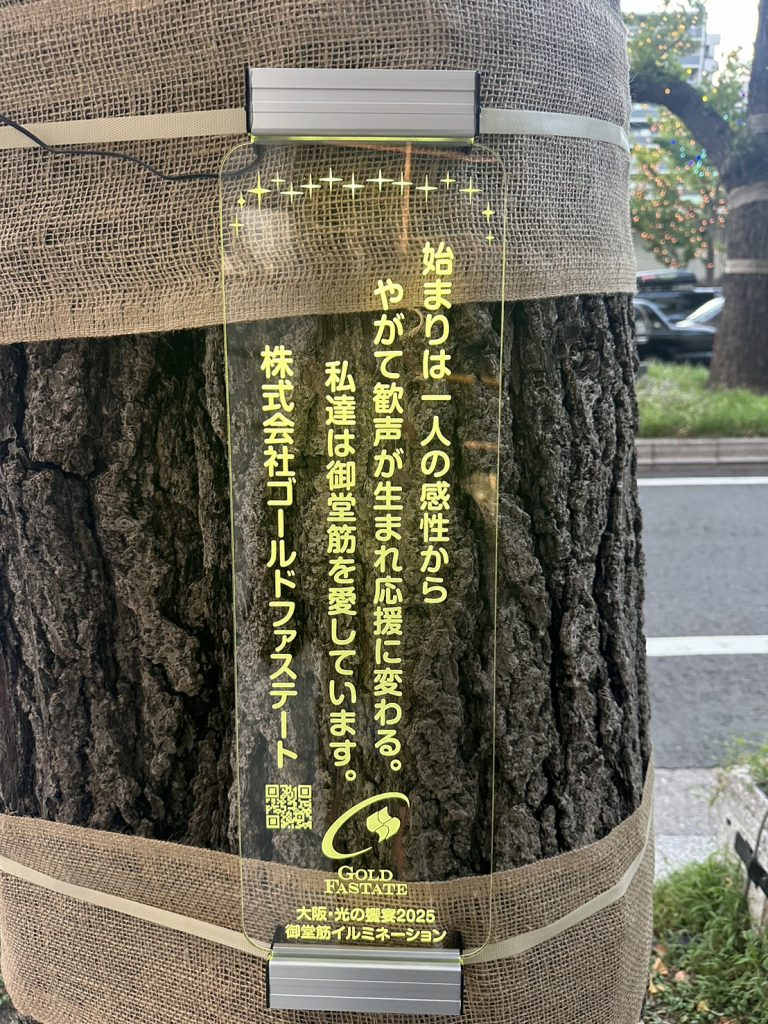 この度御堂筋を彩るイルミネーション事業「御堂筋サポーターズツリー」に賛同し、寄附を行うとともに、本日よりLEDプレートを設置いたしました。